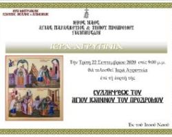 Την Τρίτη 22 Σεπτεμβρίου, στις 9.00 μ.μ., θα τελεσθεί Ιερά Αγρυπνία για την εορτή της Συλλήψεως του Τιμίου Προδρόμου στον […]
