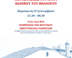 Την Παρασκευή 25 Σεπτεμβρίου, από 21.30 έως 00.30, στον ιερό ενοριακό ναό Κοιμήσεως της Θεοτόκου (Μητρόπολη) Γιαννιτσών θα πραγματοποιηθεί Αγρυπνία […]