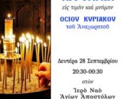 Τη Δευτέρα 28 Σεπτεμβρίου στον Ιερό Ναό Αγίων Αποστόλων Πέτρου και Παύλου Γιαννιτσών, από 20.30 έως 01.00, θα τελεσθεί Αγρυπνία […]