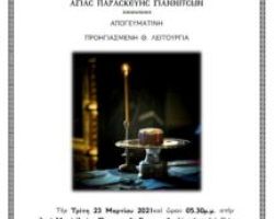 Την Τρίτη 23 Μαρτίου, στις 17.30, στην Ιερά Μονή Αγίας Παρασκευής Γιαννιτσών θα τελεσθεί η Θεία Λειτουργία των Προηγιασμένων Δώρων.