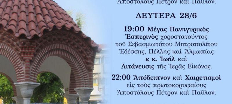 Την Τρίτη 29 Ιουνίου 2021, εορτή των Αγίων Πρωτοκορυφαίων Αποστόλων Πέτρου και Παύλου πανηγυρίζει ο φερώνυμος Ιερός Ναός της πόλεως […]