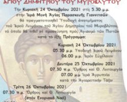 Την Κυριακή 24 Οκτωβρίου 2021στις 5.30 μ.μ. στην Ιερά Μονή Αγίας Παρασκευής Γιαννιτσών θα πραγματοποιηθεί Υποδοχή αποτμήματος του Ιερού Λειψάνου […]
