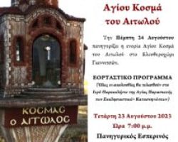 Την Πέμπτη 24 Αυγούστου πανηγυρίζει η ενορία Αγίου Κοσμά του Αιτωλού στο Ελευθεροχώρι Γιαννιτσών. ΕΟΡΤΑΣΤΙΚΟ ΠΡΟΓΡΑΜΜΑ Τετάρτη 23/8 7:00 μ.μ. […]