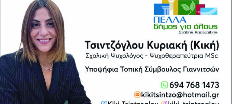 Αγαπητοί συνδημότες , Ονομάζομαι Τσιντζόγλου Κική, γεννήθηκα και μεγάλωσα στα Γιαννιτσά όπου αποφοίτησα από το 1ο λύκειο Γιαννιτσών το έτος […]