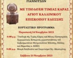 Το Σάββατο 25 Νοεμβρίου, μνήμη της Αγίας Μεγαλομάρτυρος και Πανσόφου Αικατερίνης, πανηγυρίζει το φερώνυμο Ιερό Παρεκκλήσιο της ενορίας Αγίων Κωνσταντίνου […]
