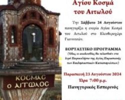 Την Πέμπτη 24 Αυγούστου πανηγυρίζει η ενορία Αγίου Κοσμά του Αιτωλού στο Ελευθεροχώρι Γιαννιτσών. ΕΟΡΤΑΣΤΙΚΟ ΠΡΟΓΡΑΜΜΑ Παρασκευή 23/8 7:00 μ.μ. Πανηγυρικός Εσπερινός Σάββατο 24/8 7:00 […]