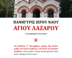 Την Πέμπτη 17 Οκτωβρίου, μνήμη της Ανακομιδής του ιερού λειψάνου του Αγίου και Δικαίου Λαζάρου, πανηγυρίζει ο Ιερός Κοιμητηριακός Ναός […]
