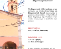 Την Παρασκευή 18 Οκτωβρίου, μνήμη του αγίου ενδόξου Αποστόλου και Ευαγγελιστού Λουκά, πανηγυρίζει το φερώνυμο παρεκκλήσιο εντός του Ιερού Ναού […]