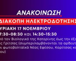 Σύμφωνα με ενημέρωση από τον ΔΕΔΔΗΕ, έχουν προγραμματιστεί οι παρακάτω διακοπές στην ηλεκτροδότηση: Κυριακή 17 Νοεμβρίου 2024 Ώρες: 07:30-08:30 και 14:30-15:30 Περιοχή: Από τον […]