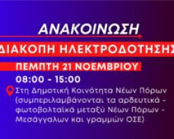 Σύμφωνα με ενημέρωση του ΔΕΔΔΗΕ έχει προγραμματιστεί η ακόλουθη διακοπή ηλεκτροδότησης: Ημέρα: Πέμπτη 21 Νοεμβρίου 2024 Ώρες: 08:00 – 15:00 Περιοχή: Στη Δημοτική […]