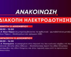 Σύμφωνα με ενημέρωση του ΔΕΔΔΗΕ, έχουν προγραμματιστεί οι ακόλουθες διακοπές στην ηλεκτροδότηση: Περιοχή: Δ.Κ. Νέων Πόρων και αρδευτικά, φωτοβολταϊκά μεταξύ […]