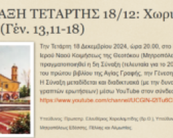 Την Τετάρτη 18 Δεκεμβρίου 2024, ώρα 20.00, στο Ενοριακό Κέντρο του Ιερού Ναού Κοιμήσεως της Θεοτόκου (Μητροπόλεως) Γιαννιτσών θα πραγματοποιηθεί […]