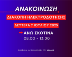Σύμφωνα με ενημέρωση από τον ΔΕΔΔΗΕ, έχει προγραμματιστεί η παρακάτω διακοπή στην ηλεκτροδότηση: Δευτέρα 7 Ιουλίου 2025 Ώρες: 08:00 – […]