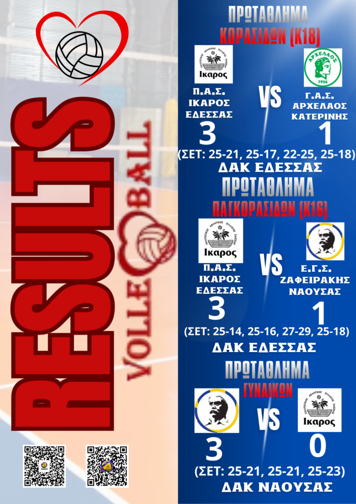 Την Κυριακή, οι Παγκορασίδες (Κ16) της ομάδας βόλει Π.Α.Σ. ΙΚΑΡΟΣ ΕΔΕΣΣΑΣ επιβεβαίωσαν την ανωτερότητά τους και την σωστή δουλεία που γίνεται στις μικρότερες ηλικίες, κόντρα στον Ζαφειράκη Νάουσας. Η ομάδα της Έδεσσς κέρδισε χωρίς καμιά αντίσταση 3-1 την ομάδα της Νάουσας. Ο Ίκαρος είχε τον πλήρη έλεγχο καθ’ όλη την διάρκεια του αγώνα. Ένα εύκολο παιχνίδι για την ομάδα της Έδεσσας όπως φάνηκε κι από την διαφορά που υπήρχε στους πόντους, αφού εκτός από ένα σετ (στο οποίο δοκιμάστηκαν διάφορα σχήματα) η φιλοξενούμενη ομάδα δεν πλησίαζε την καλά δουλεμένη ομάδα της Εδεσσας.