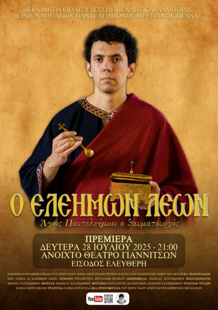 Η Κινηματογραφική ομάδα της ενορίας Αγίων Αποστόλων Πέτρου και Παύλου Γιαννιτσών "Josef van Den Berg" με την ευλογία της Ιεράς Μητροπόλεως Εδέσσης Πέλλης και Αλμωπίας και με πρωτοβουλία του Ι.Ν. Αγίου Παντελεήμονος Μεσσιανού Πέλλας ετοίμασε και παρουσιάζει σε πρώτη προβολή την ταινία «Ο Ελεήμων Λέων (Άγιος Παντελεήμων ο Θαυματουργός)» την Δευτέρα 28 Ιουλίου 2025 και ώρα 21.00 στο Ανοιχτό Θέατρο Γιαννιτσών.