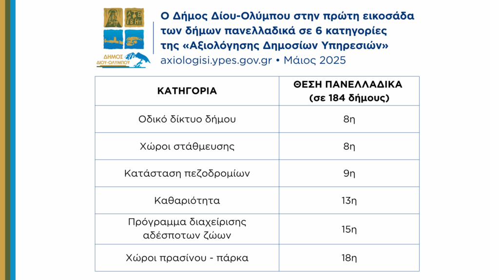 Πιο συγκεκριμένα, με βάση τη δική σας αξιολόγηση, ο Δήμος Δίου-Ολύμπου κατετάγη στις θέσεις από 8 έως 18, σε σύνολο 184 δήμων που αξιολογήθηκαν πανελλαδικά.