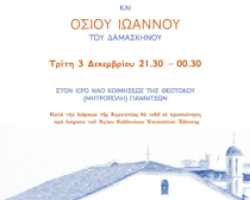 Την Τρίτη 3 Δεκεμβρίου, από ώρα 21.30 έως 00.30, στον ιστορικό ιερό ενοριακό ναό Κοιμήσεως της Θεοτόκου (Μητρόπολη) Γιαννιτσών θα […]