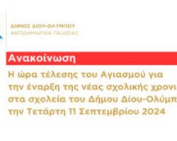 Από την Αντιδημαρχία Παιδείας του Δήμου Δίου-Ολύμπου ανακοινώνεται ότι η ώρα τέλεσης του Αγιασμού για την έναρξη της νέας σχολικής […]