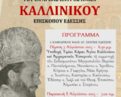 Την Πέμπτη 7 Αυγούστου 2025, εορτή του Αγίου Καλλινίκου Επισκόπου Εδέσσης τελέσθηκε Αρχιερατικός Εσπερινός στον πανηγυρίζοντα φερώνυμο ιερό ναό της […]