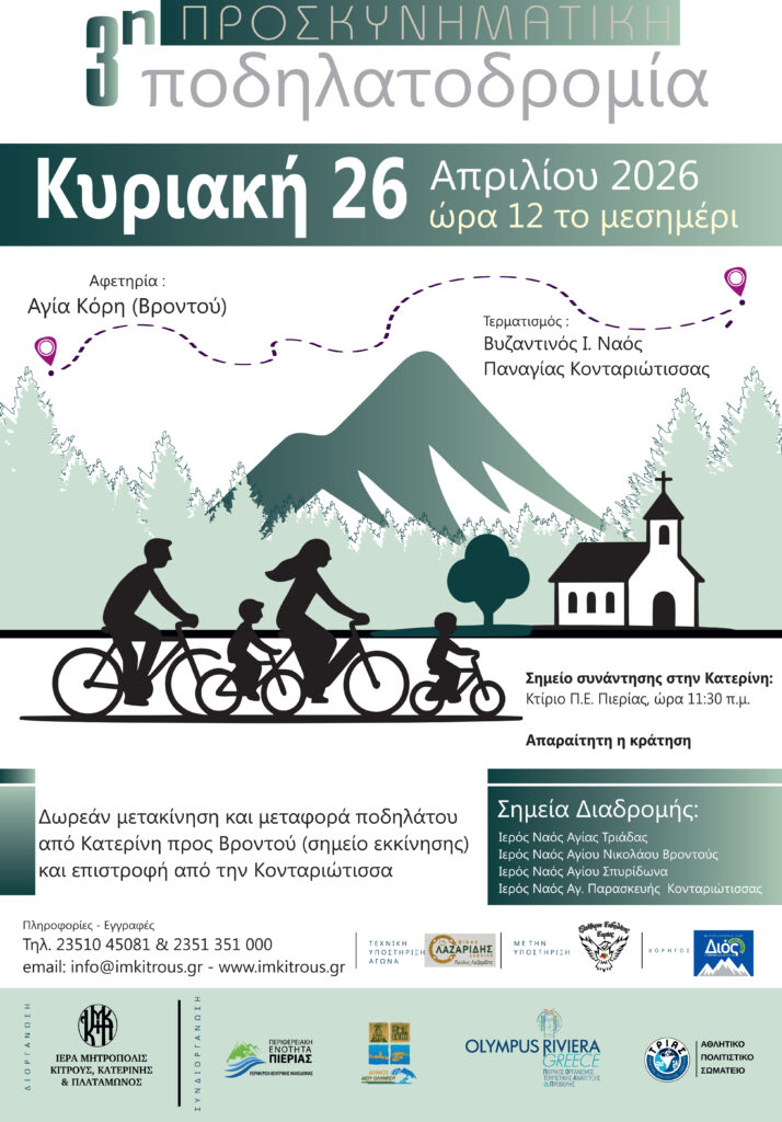 Την ποδηλατική δράση διοργανώνει για τρίτη χρονιά η Ιερά Μητρόπολη Κίτρους, Κατερίνης και Πλαταμώνος, με πρωτοβουλία του Σεβασμιώτατου Ποιμενάρχη κ. Γεωργίου σε συνεργασία με την Περιφερειακή Ενότητα Πιερίας, τον Πιερικό Οργανισμό Τουριστικής Ανάπτυξης και Προβολής (Π.Ο.Τ.Α.Π.), τον Δήμο Δίου-Ολύμπου και το Αθλητικό Πολιτιστικό Σωματείο «ΤΡΙΑΣ». Υποστηρίζεται από τους «Ελεύθερους Ποδηλάτες», την Ελληνική Αστυνομία, το Τμήμα Κατερίνης του Ελληνικού Ερυθρού Σταυρού, τη Διασωστική Ομάδα Πιερίας, φορείς και συλλόγους του νομού.