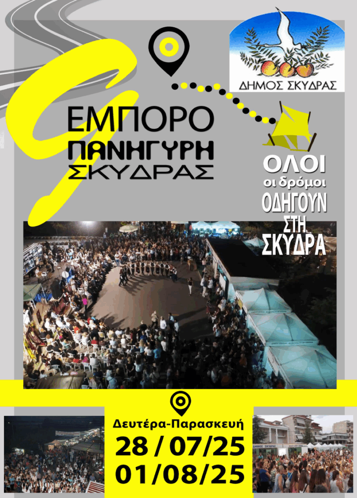 - Ο Εμπορικός Σύλλογος Σκύδρας συμμετέχει στην 9η Εμποροπανήγυρη Σκύδρας 2025 με την πραγματοποίηση της «ΛΕΥΚΗΣ ΝΥΧΤΑΣ», οπότε τα καταστήματα θα παραμείνουν ανοιχτά έως τις 11:00΄ το βράδυ με μεγάλες προσφορές!
