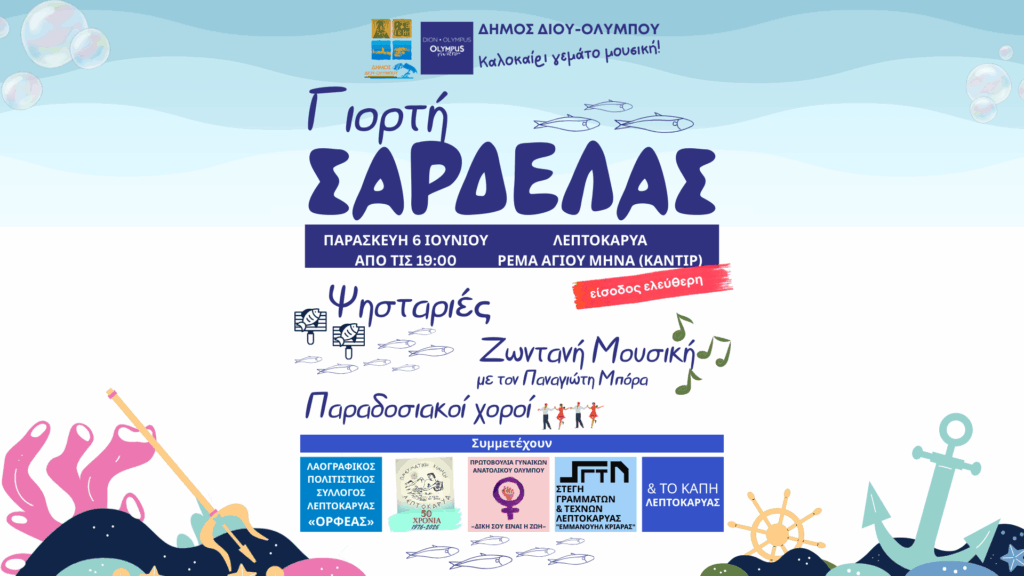 Ο Δήμος Δίου-Ολύμπου σας προσκαλεί την Παρασκευή 6 Ιουνίου 2025, από τις 7 μμ, στην «Γιορτή Σαρδέλας», που θα πραγματοποιηθεί στη Λεπτοκαρυά, ρέμα Αγίου Μηνά (Καντίρ).