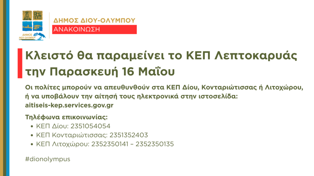 Κλειστό θα παραμείνει το ΚΕΠ Λεπτοκαρυάς την Παρασκευή 16 Μαΐου 2025.