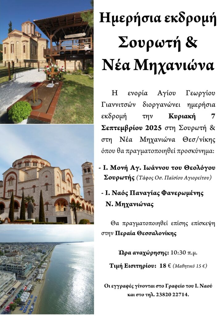 Η ενορία Αγίου Γεωργίου Γιαννιτσών διοργανώνει ημερήσια εκδρομή την Κυριακή 7 Σεπτεμβρίου 2025 στη Σουρωτή και στη Νέα Μηχανιώνα Θεσσαλονίκης  όπου θα  προσκύνημα:
