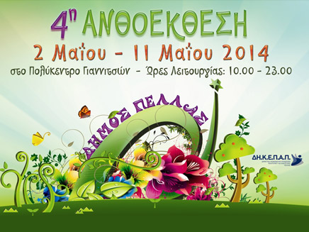 Ο Δήμος Πέλλας και η ΔΗ.Κ.Ε.Π.Α.Π σας προσκαλούν στα εγκαίνια της 4ης Ανθοέκθεσης που θα πραγματοποιηθούν την Παρασκευή 2 Μαΐου στις 7:00 μ.μ. στο χώρο του Πολύκεντρου Γιαννιτσών. Την εκδήλωση θα πλαισιώσουν μουσικά οι μαθητές του Αλεξάνδρειου Ωδείου Γιαννιτσών.