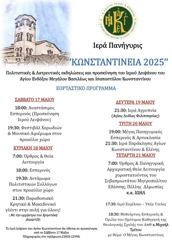 Ο Ιερός Ναός Αγίων Κωνσταντίνου και Ελένης Γιαννιτσών ανακοινώνει το πρόγραμμα των ιερών ακολουθιών και των πολιτιστικών εκδηλώσεων «Κωνσταντίνεια 2025» με αφορμή την ετήσια πανήγυρη της ενορίας επί τη μνήμη των αγίων και ενδόξων Θεοστέπτων Βασιλέων και Ισαποστόλων Κωνσταντίνου και Ελένης από το Σάββατο 17 Μαΐου έως και την Τετάρτη 21 Μαΐου.