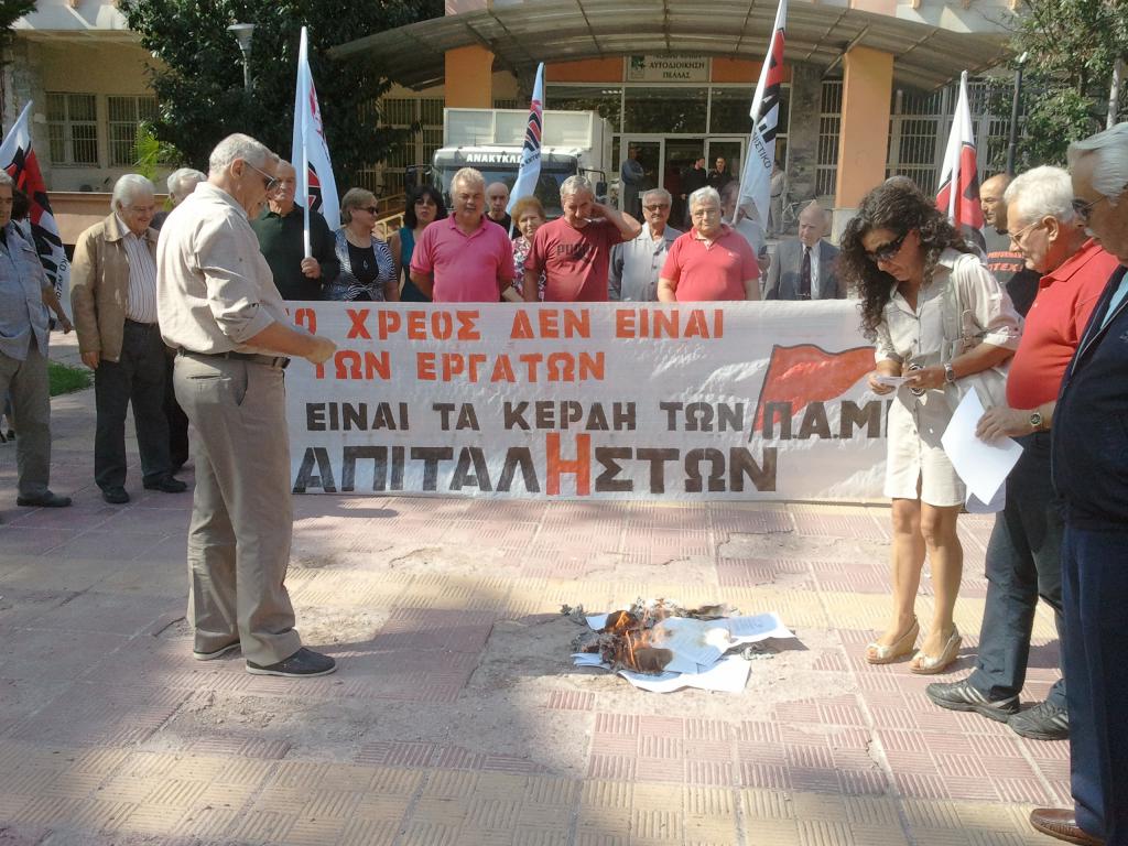 ΟΡΓΑΝΩΜΕΝΗ ΑΡΝΗΣΗ ΠΛΗΡΩΜΗΣ με το ΠΑΜΕ των ΧΑΡΑΤΣΙΩΝ στις ΕΦΟΡΙΕΣ ΕΔΕΣΣΑΣ , ΣΚΥΔΡΑΣ & ΓΙΑΝΝΙΤΣΩΝ στο ΝΟΜΟ ΠΕΛΛΑΣ Με πρωτοβουλία του ΠΑΜΕ οργανώθηκαν τη Τρίτη 27 & Τετάρτη 28 Σεπτέμβρη εκδηλώσεις διαμαρτυρίας και άρνησης πληρωμής των δυσβάσταχτων & άδικων χαρατσιών έξω από τις Εφορίες Έδεσσας , Σκύδρας & Γιαννιτσών . Συγκεντρώθηκε σημαντικός αριθμός ειδοποιητηρίων πληρωμής , που κάηκαν συμβολικά έξω από τις ΔΟΥ των πόλεων του Νομού . Μοιράζονταν σε όσους πήγαιναν για να πληρώσουν τα χαράτσια ανακοίνωση του ΠΑΜΕ καταδίκης των άδικων χαρατσιών & κάλεσμα οργανωμένης άρνησης πληρωμής , όπου τονίζονταν σχετικά : «Αρνούμαστε συλλογικά & μαζικά την πληρωμή των δυσβάσταχτων και άδικων χαρατσιών . Επι-στρέφουμε το λογαριασμό αρνούμενοι τη νέα ληστεία στο λαϊκό εισόδημα με την ειδική εισφορά «αλληλεγγύης» , με τα ειδικό τέλος στα σπίτια μέσα από τον λογαριασμό της ΔΕΗ, για να μη πτω-χεύσει η πλουτοκρατία. Συλλογικά, μαχητικά να σταθούμε απέναντι σε όλους αυτούς που μας οδηγούν στον γκρεμό. Οι ορντινάντσες της πλουτοκρατίας τα κόμματα που την υπηρετούν ΠΑΣΟΚ, Ν.Δ., ΛΑΟΣ, ΜΠΑΚΟΓΙΑΝΝΗ, με τις πολιτικές τους αποφάσεις καταδυναστεύουν σε όλους τους τομείς της ζωής, την εργατική, λαϊκή οικογένεια. Το βαρέλι των αντεργατικών μέτρων δεν έχει πάτο. ● Επιβάλλουν στους εργαζόμενους νέο φόρο, «αλληλεγγύης», για να πληρώσουν τα χρέη τους. ● Φέρνουν τροπολογία στη βουλή και απαιτούν από τον εργάτη που με κόπο μιας ολόκληρης ζωής κατάφερε να κάνει ένα σπίτι, να το ξαναπληρώσει με νέα δυσβάσταχτα χαράτσια μέσα από τους λογαριασμούς της ΔΕΗ. Είναι αδίστακτοι, Ενώ οδήγησαν στην ανεργία, απολύοντας χιλιάδες εργαζόμενους όχι μόνο δεν τους εξαιρούν απ' αυτό το χαράτσι για το σπίτι, αλλά τους φορολογούν με τους ίδιους συντελεστές. Ενώ οδήγησαν στην απραξία & στο κλείσιμο πολλών μαγαζιών ζητούν και από τους «υπό διωγμό» μικροεμπόρους & μικροβιοτέχνες ζητούν και απ'αυτούς να σώσουν τη πατρίδα . Ενώ με τις αντιαγροτικές πολιτικές τους οδήγησαν & οδηγούν χιλιάδες μικροαγροτές στο ξεκλήρισμα & τον αφανισμό , ζητούν και απ'αυτούς να συμβάλουν . Την ίδια ώρα επικαλούνται τη νομιμότητα . Γι'αυτούς είναι νόμιμο οι καπιταλιστές να έχουν 600 δισ. στην Ελβετία . Είναι νόμιμο οι καπιταλιστές να πληρώνουν ελάχιστους φόρους ή και καθόλου. Είναι νόμιμο 6.000 επιχειρήσεις να χρωστάνε 31 δισ. σε φόρους. Ε, λοιπόν απαντάμε ξεκάθαρα : Νόμιμο είναι ό,τι συμφέρει το λαό και όχι την πλουτοκρατία ! Καλούμε όλους και όλες οργανωμένα και αγωνιστικά να απαντήσουμε στους φόρους που μας πνίγουν, στα άγρια μέτρα που μας καταδικάζουν οριστικά στη φτώχεια και στην ανασφάλεια. «Δεν έχουμε , δεν μπορούμε , δεν θέλουμε να πληρώσουμε τα χαράτσια σας» Το χρέος είναι της πλουτοκρατίας ! Κανένας φόβος από τις απειλές που εκτοξεύουν καθημερινά κυβέρνηση και τα παπαγαλάκια της. Γραμματεία ΠΑΜΕ Ν.Πέλλας