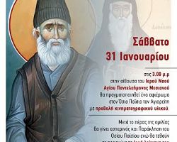 Το Σάββατο 31 Ιανουαρίου, στις 3.00 μ.μ., στην αίθουσα του Ιερού Ναού Αγίου Παντελεήμονος Μεσιανού θα πραγματοποιηθεί Εκδήλωση – Αφιέρωμα […]