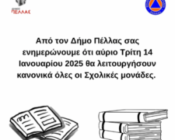 Από τον Δήμο Πέλλας σας ενημερώνουμε ότι αύριο Τρίτη 14 Ιανουαρίου 2025 θα λειτουργήσουν κανονικά όλες οι Σχολικές μονάδες.