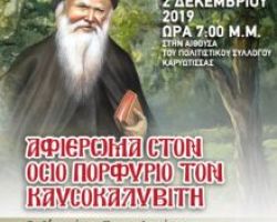 Την Δευτέρα 2 Δεκεμβρίου 2019, ώρα 7.00 μ.μ., η ενορία Κοιμήσεως της Θεοτόκου Καρυώτισσας διοργανώνει Εκδήλωση – Αφιέρωμα στον όσιο […]