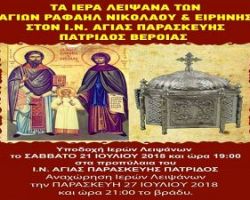 Το Σάββατο 21 Ιουλίου 2018, ώρα 19.00, στον Ι.Ν. Αγίας Παρασκευής στην Πατρίδα Βέροιας, θα πραγματοποιηθεί η υποδοχή των Τιμίων […]