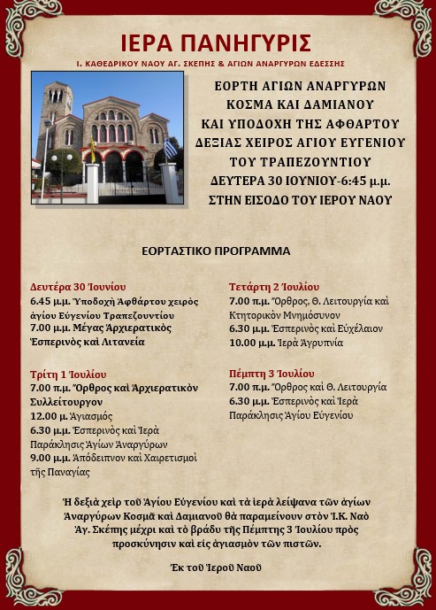 6.30 μ.μ. Εσπερινός και Ιερά Παράκλησις Αγίων Αναργύρων