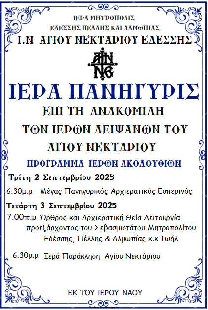 Την Τετάρτη 3 Σεπτεμβρίου πανηγυρίζει ο Ιερός Ναός Αγίου Νεκταρίου Εδέσσης την ανακομιδή των ιερών λειψάνων του Αγίου Νεκταρίου.