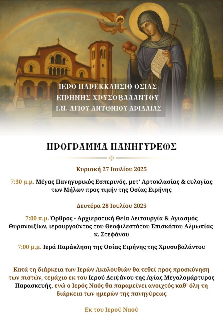 Την Δευτέρα 28 Ιουλίου πανηγυρίζει το ιερό παρεκκλήσιο της Οσίας Ειρήνης της Χρυσοβαλάντου στην ενορία του Αγίου Αντωνίου στην Αριδαία. Την ημέρα της εορτής θα τελεσθούν τα Θυρανοίξια του ιερού παρεκκλησίου.