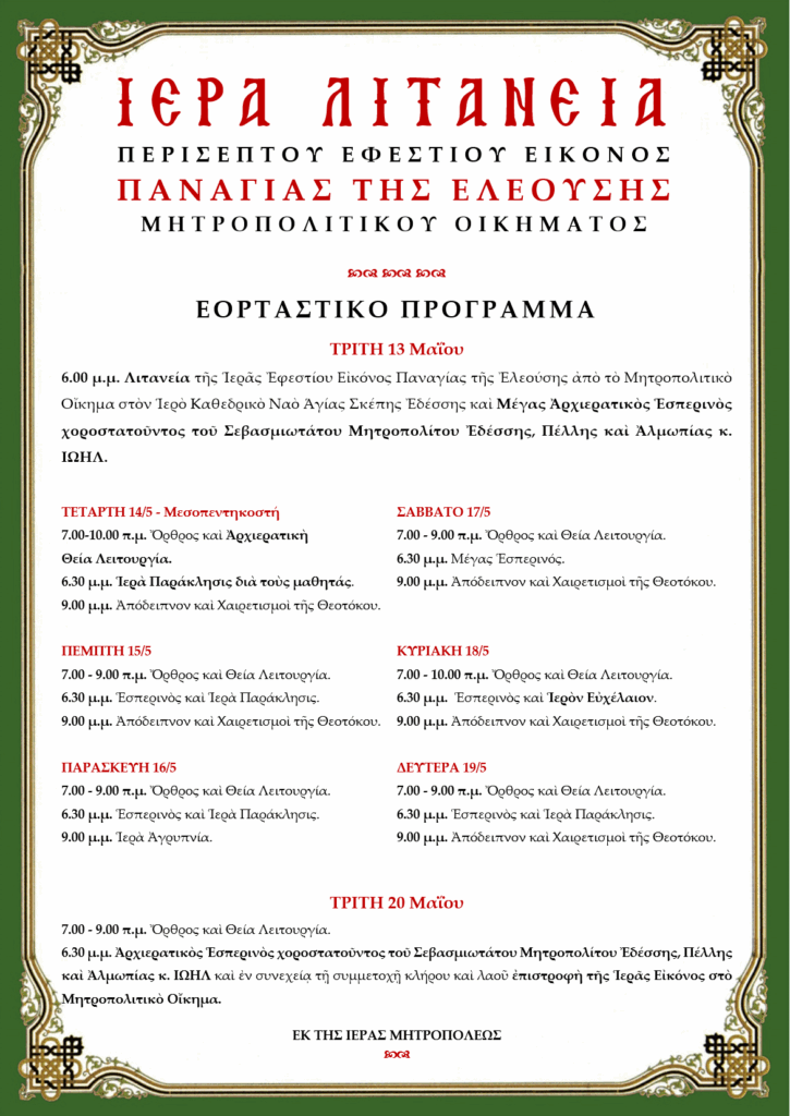 6.00 μ.μ. Λιτανεία της Ιεράς Εφεστίου Εικόνος Παναγίας της Ελεούσης από το Μητροπολιτικό Οίκημα στον Ι. Καθεδρικό Ναό Αγίας Σκέπης Εδέσσης και Μέγας Αρχιερατικός Εσπερινός χοροστατούντος του Σεβ. Μητροπολίτου Εδέσσης, Πέλλης και Αλμωπίας κ. Ιωήλ.