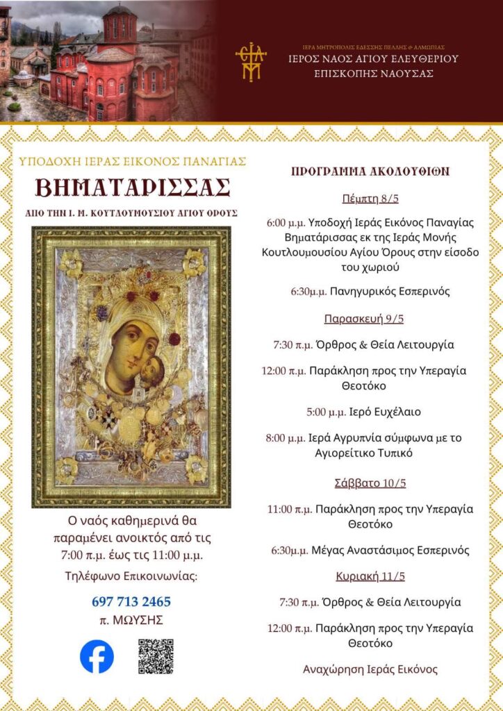 Πρόγραμμα ιερών ακολουθιών, οι οποίες θα τελεσθούν στον ιερό ναό Αγίου Ελευθερίου Επισκοπής Ναούσης κατά την διάρκεια της παραμονής της ιεράς εικόνος Παναγίας της «Βηματάρισσας» (8-11 Μαΐου 2025).