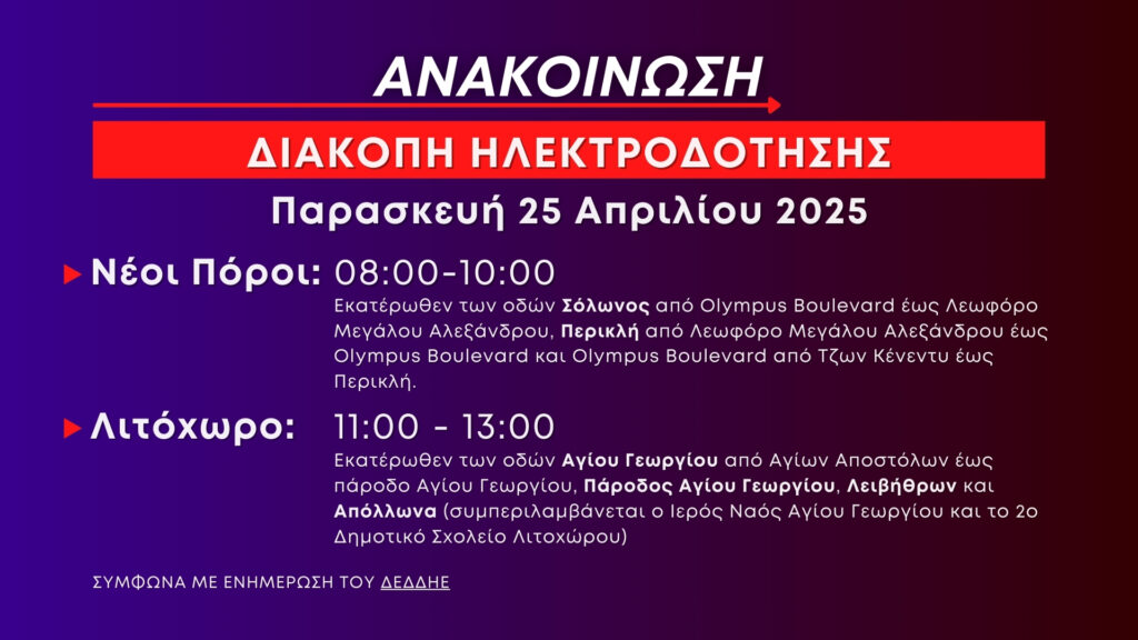 Σύμφωνα με ενημέρωση του ΔΕΔΔΗΕ, έχουν προγραμματιστεί οι ακόλουθες διακοπές στην ηλεκτροδότηση: